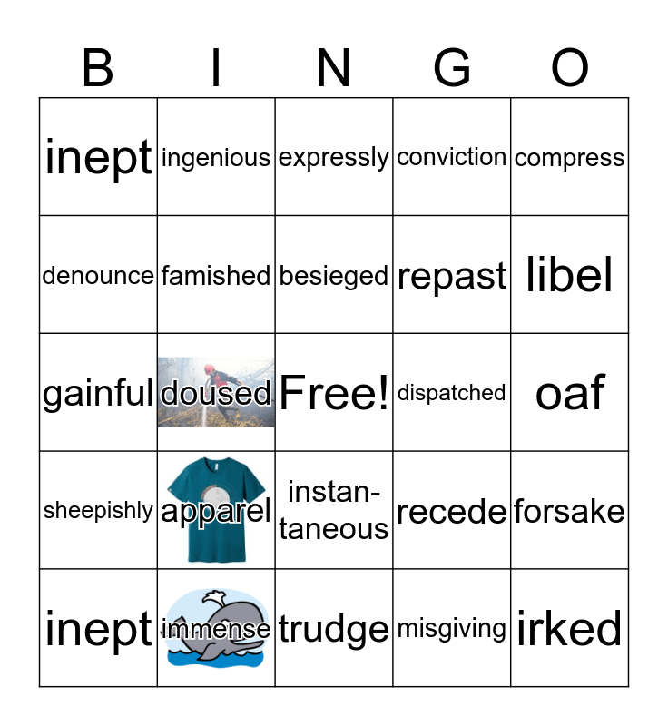 This bingo card has 3 images, a free space and 24 words: apparel, immense, besieged, inept, compress, inept, denounce, ingenious, dispatched, instan-taneous, repast, gainful, recede, forsake, famished, misgiving, oaf, expressly, libel, doused, irked, sheepishly, conviction and trudge.