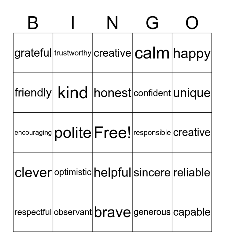 This bingo card has a free space and 34 words: cheerful, generous, fun, positive, creative, friendly, kind, brave, confident, capable, encouraging, trustworthy, generous, honest, clever, polite, helpful, responsible, reliable, respectful, observant, strong, calm, unique, loyal, optimistic, creative, kind, happy, grateful, respectful, honest, sincere and polite.