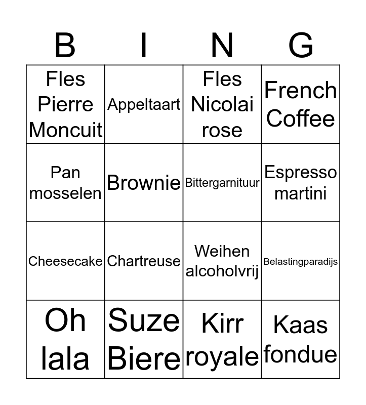 This bingo card has 31 words: Free!, bier, Belastingparadijs, Kinderlunch, Fles Pierre Moncuit, Fles Nicolai rose, Bittergarnituur, Mimosa, Suze Biere, Picon Biere, Kirr royale, Oh lala, Plateau Fruitsdemer, Eau de vie, Chartreuse, Pastis, Montifaud XO, Poulet joune, Kaas fondue, Zeewolf, Pan mosselen, Bokbier, Groentecurry, Appeltaart, Cheesecake, Brownie, French Coffee, Weihen alcoholvrij, Orange/ginger, Espresso martini and Oeuf Guyere.