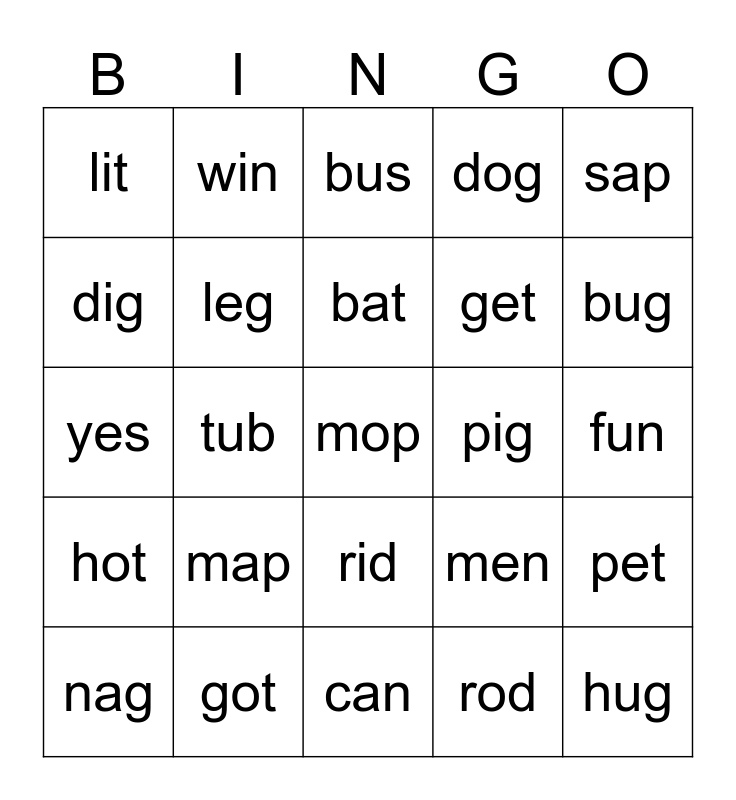 This bingo card has 25 words: map, can, bat, nag, sap, lit, dig, win, pig, rid, get, yes, men, pet, leg, hug, fun, bus, bug, tub, mop, got, hot, dog and rod.