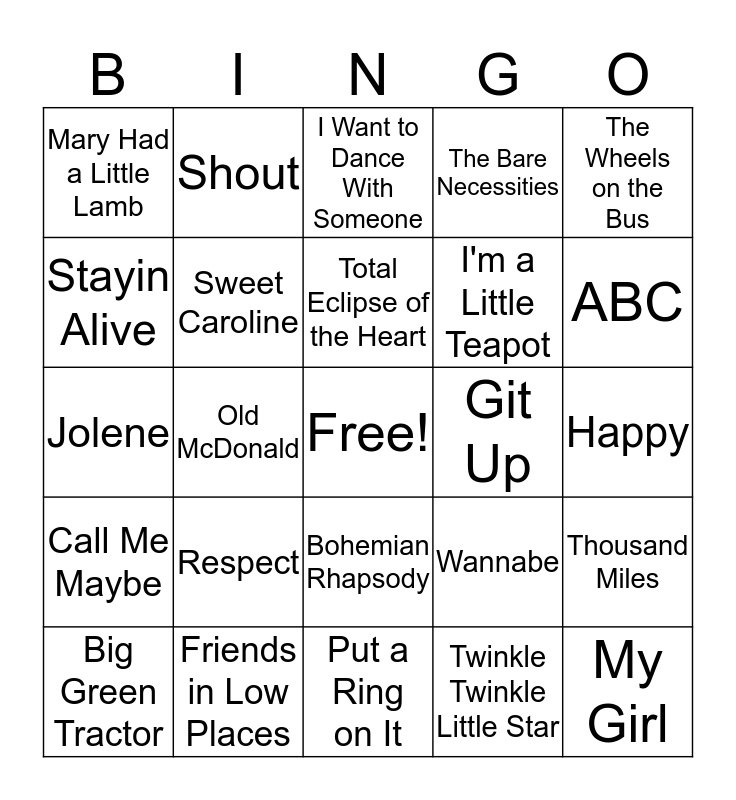 This bingo card has a free space and 47 words: Man! I feel like a Woman, My Girl, Party in the USA, Put a Ring on It, Respect, Shake it Off, Shout, Speechless, Stayin Alive, Summer Nights, Sweet Caroline, The Bare Necessities, Thousand Miles, Wannabe, Wonderwall, My Heart Will Go On, Total Eclipse of the Heart, Git Up, Old Town Road, The Wheels on the Bus, Old McDonald, Twinkle Twinkle Little Star, Mary Had a Little Lamb, I'm a Little Teapot, We are the Champions, ABC, Big Green Tractor, Billie Jean, Bohemian Rhapsody, Call Me Maybe, Born in the USA, Danger Zone, Eye of the Tiger, Do you Believe in Magic, Free Falling, Friends in Low Places, Happy, Hey Look Ma I Made It, Hey Ya, I Got that Feeling, I Walk the Line, I Want to Dance With Someone, Jolene, I've Had the Time of My Life, Let It Go, Livin on a Prayer and Living La Vida Loca.