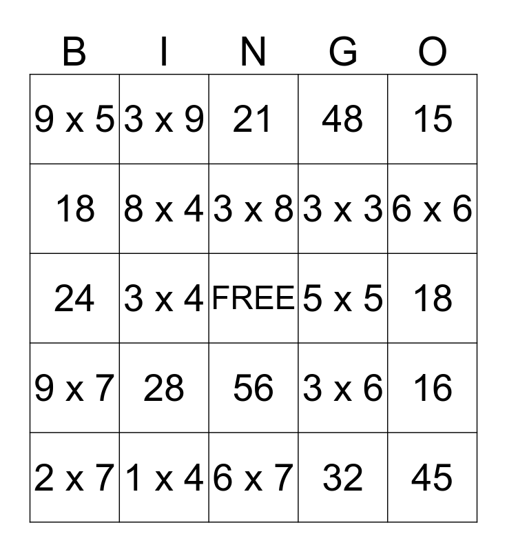 This bingo card has a free space and 29 words: 2 x 7, 35, 3 x 4, 8, 9 x 5, 21, 8 x 4, 28, 5 x 5, 1 x 4, 18, 45, 6 x 7, 32, 6 x 6, 10 x 4, 56, 9 x 7, 15, 24, 3 x 6, 60, 3 x 3, 18, 48, 3 x 9, 16, 3 x 8 and 81.