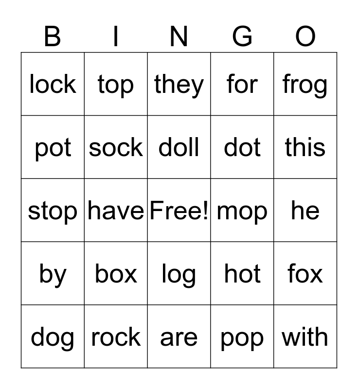This bingo card has a free space and 24 words: box, rock, doll, dog, frog, lock, pot, top, mop, log, dot, stop, hot, fox, sock, pop, he, they, this, have, with, by, for and are.