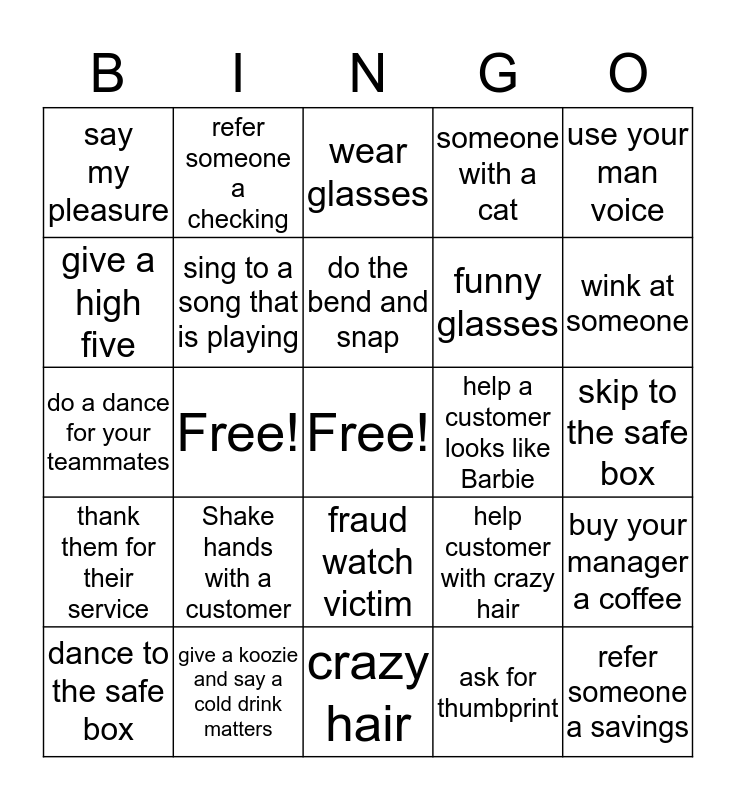 This bingo card has a free space and 24 words: Shake hands with a customer, give a koozie and say a cold drink matters, do the bend and snap, dance to the safe box, use your man voice, say my pleasure, give a high five, refer someone a checking, help a customer looks like Barbie, fraud watch victim, funny glasses, do a dance for your teammates, help customer with crazy hair, buy your manager a coffee, sing to a song that is playing, ask for thumbprint, skip to the safe box, wear glasses, wink at someone, Free!, refer someone a savings, thank them for their service, someone with a cat and crazy hair.