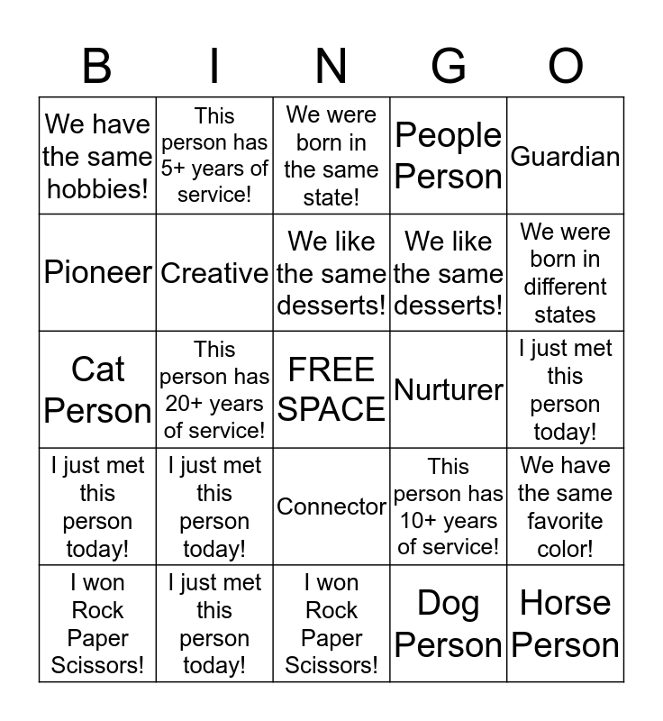 This bingo card has a free space and 24 words: I won Rock Paper Scissors!, I just met this person today!, We like the same desserts!, Dog Person, Guardian, We have the same hobbies!, This person has 5+ years of service!, We were born in the same state!, Nurturer, I just met this person today!, Cat Person, Creative, This person has 10+ years of service!, We have the same favorite color!, Pioneer, I just met this person today!, I won Rock Paper Scissors!, People Person, We were born in different states, I just met this person today!, This person has 20+ years of service!, Connector, We like the same desserts! and Horse Person.