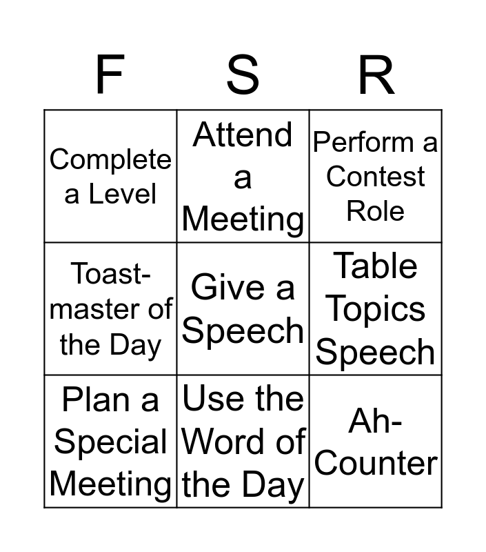 This bingo card has a free space and 17 words: Speech Evaluator, Grammar-ian, Table Topics Speech, Complete a Level, Attend a Committee Meeting, Toast-master of the Day, Attend a Board Meeting, Ah-Counter, Plan a Special Meeting, Use the Word of the Day, General Evaluator, Table Topics Master, Attend a Meeting, Perform a Contest Role, Mentor a Member, Complete the Survey and Timer.