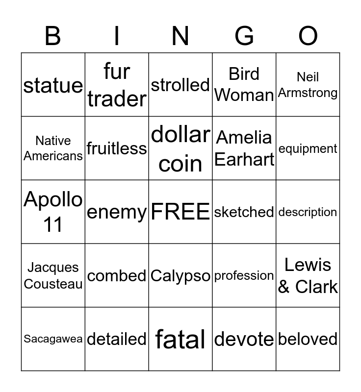 This bingo card has a free space and 29 words: Sacagawea, language, enemy, honored, statue, strolled, fruitless, combed, sketched, detailed, description, beloved, fatal, devote, equipment, exploring, Calypso, Jacques Cousteau, Neil Armstrong, Apollo 11, profession, license, Amelia Earhart, Native Americans, Bird Woman, fur trader, Lewis & Clark, dollar coin and expression.