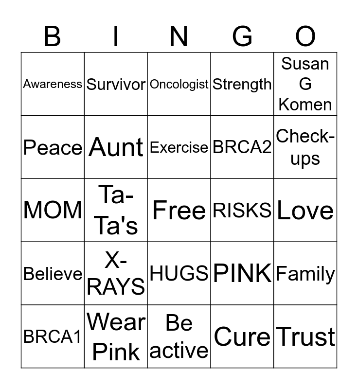This bingo card has a free space and 33 words: Passion, Stay strong, Exercise, Remission, Love, Awareness, Aunt, Be active, BRCA2, Trust, Peace, Survivor, Cure, Ribbon, MOM, Ta-Ta's, HUGS, PINK, Family, Believe, Wear Pink, Hearts, Strength, Check-ups, Fights, X-RAYS, Oncologist, RISKS, Susan G Komen, BRCA1, WIN, HEARTS and CURE.