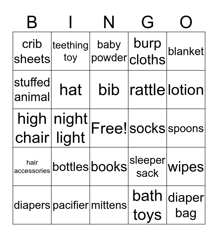 This bingo card has a free space and 24 words: bottles, pacifier, bib, diapers, blanket, crib sheets, stuffed animal, teething toy, socks, books, rattle, high chair, sleeper sack, wipes, hat, bath toys, spoons, baby powder, lotion, night light, diaper bag, hair accessories, burp cloths and mittens.