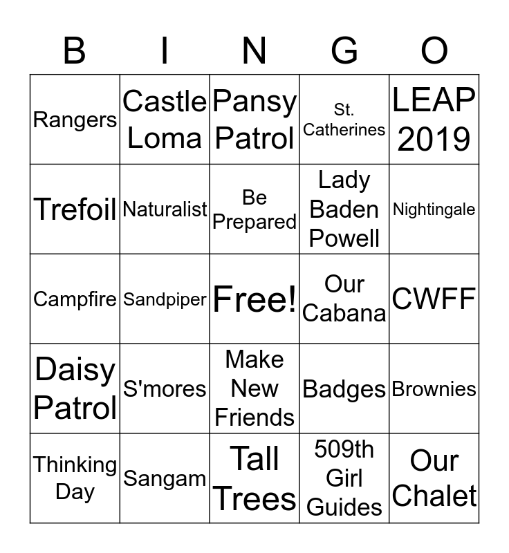 This bingo card has a free space and 59 words: Lord Baden Powell, Sangam, Promise, Daisy Patrol, 509th Girl Guides, Pathfinders, Naturalist, Sparks, Lady Baden Powell, 1910, St. Catherines, Lady Mary Pellatt, Trefoil, Agnes Baden Powell, WAGGGS, Rangers, Our Chalet, LEAP 2019, Cookies, Be Prepared, Our Cabana, Pansy Patrol, Thinking Day, Brownies, Camping, Service Projects, Daffodil Patrol, Crafts, Nightingale, Robin, Kusifiri, Feb 22, Pax Lodge, Roses Patrol, Castle Loma, Meadow lark, Trillium Patrol, Sandpiper, Hiking, Campfire, Swaps, S'mores, CWFF, Scholarship, Exploring, Bird Nerd, Guides Wear Blue, Camp Hair Don't Care, Make New Friends, Tall Trees, Games, Helping Hand, Friendship, Singing Songs, Doe Lake, Badges, Girls First, Humming bird and Guiding Law.