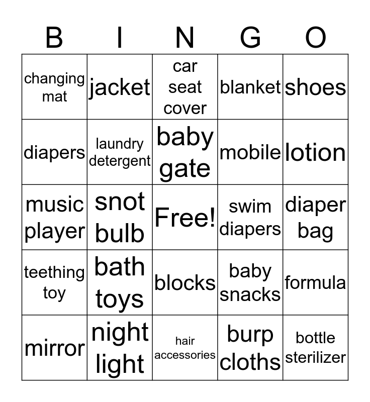 This bingo card has a free space and 29 words: mirror, bottle warmer, snot bulb, onesies, changing mat, car seat cover, laundry detergent, bath toys, swim diapers, night light, diaper bag, bottle sterilizer, hair accessories, burp cloths, lotion, crib sheets, blocks, teething toy, shoes, music player, baby snacks, pajamas, mobile, diapers, blanket, jacket, formula, baby gate and wipes.