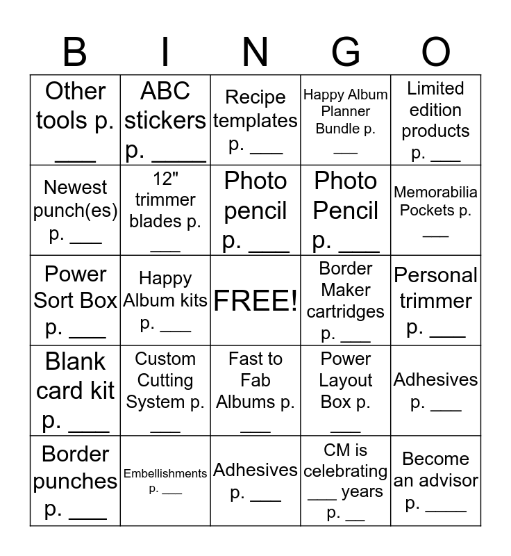 This bingo card has a free space and 34 words: Designer papers p.___, CM is celebrating ___ years p. __, Theme packs p. ____, Wooden Frame Hangar p. ___, Blank card kit p. ___, 12" trimmer blades p. ___, Limited edition products p. ___, Border punches p. ___, ABC stickers p. ____, Mat packs p. ___, Photo pencil p. ___, Recipe templates p. ___, Happy Album Kits p. ___, Cardstock p. ___, Border Maker cartridges p. ___, Memorabilia Pockets p. ___, Embellishments p. ___, Power Sort Box p. ___, Custom Cutting System p. ___, Power Layout Box p. ___, Fast to Fab Albums p. ___, Foiled albums p. ___, Other tools p. ___, Personal trimmer p. ___, Adhesives p. ___, Become an advisor p. ____, Happy Album Planner Bundle p. ___, Card Kits p. ___, Photo Pencil p. ___, Newest punch(es) p. ___, Wicked Cute papers p. ___, Happy Album kits p. ___, Adhesives p. ___ and Totes p. ___.