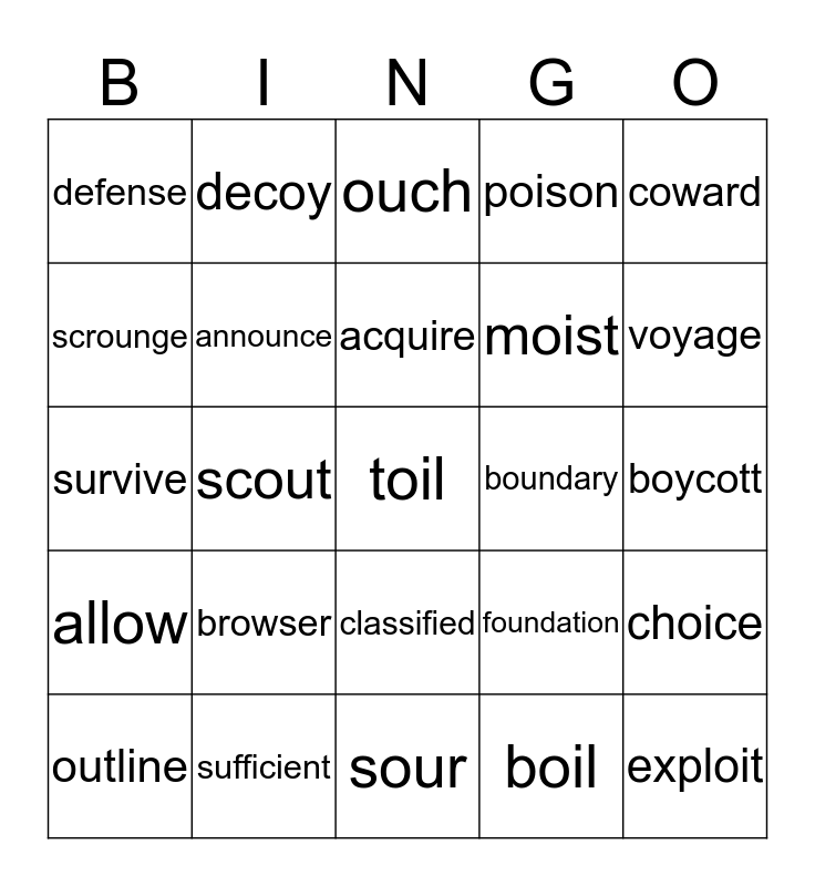 This bingo card has a free space and 24 words: browser, sufficient, acquire, outline, coward, defense, scrounge, decoy, boundary, classified, moist, survive, foundation, choice, announce, boil, boycott, ouch, voyage, scout, exploit, allow, poison and sour.