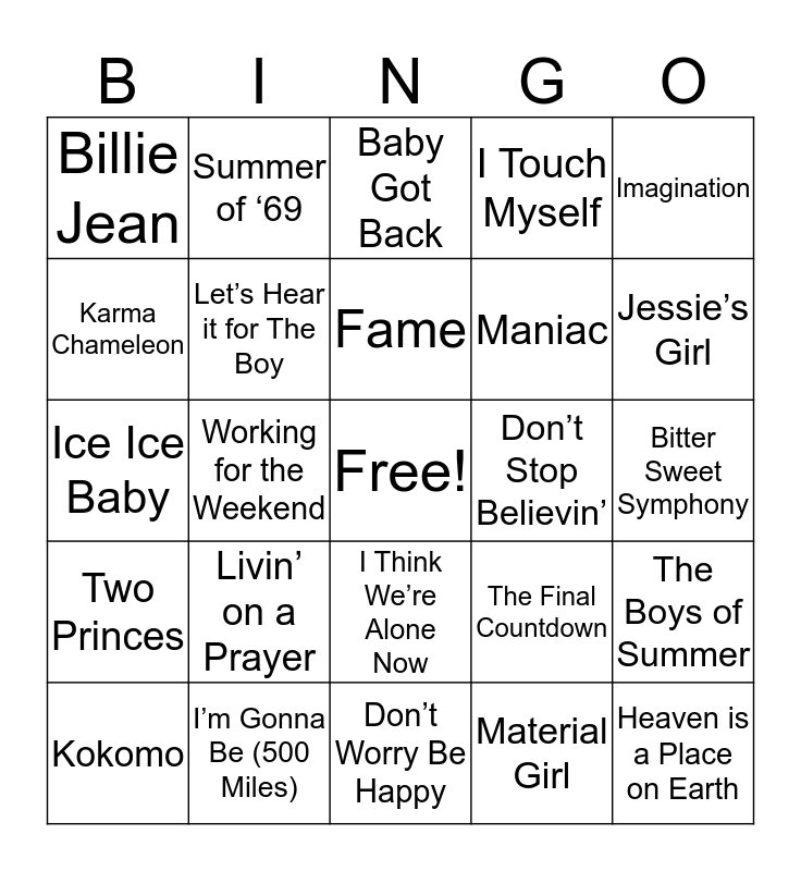 This bingo card has a free space and 46 words: Fight For Your Right, Heaven is a Place on Earth, (I’ve Had) The Time of my Life, Don’t Worry Be Happy, Livin’ on a Prayer, Total Eclipse of the Heart, Summer of ‘69, Sunglasses at Night, Karma Chameleon, Girls Just want to Have Fun, Let’s Hear it for The Boy, I Touch Myself, The Boys of Summer, The Final Countdown, Sweet Dreams (Are Made of This), Faith, Fame, Don’t Stop Believin’, Footloose, Imagination, Working for the Weekend, Material Girl, Billie Jean, Maniac, When Doves Cry, Jessie’s Girl, Kokomo, Video Killed the Radio Star, I Think We’re Alone Now, Two Princes, Shiny Happy People, It Wasn’t Me, Closing Time, 3am, Hey Jealousy, I’m Gonna Be (500 Miles), Bitter Sweet Symphony, Don’t Speak, Ironic, The Freshmen, This is How We Do it, Baby Got Back, Ice Ice Baby, Jump Around, Thong Song and I’m Too Sezy.