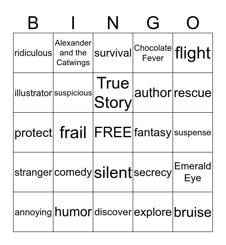 This bingo card has a free space and 29 words: annoying, clenched, frail, respectable, ridiculous, survival, suspicious, comedy, fantasy, humor, suspense, bruise, discover, explore, rescue, shiver, silent, stranger, flight, protect, secrecy, unusal, author, illustrator, Chocolate Fever, Alexander and the Catwings, Emerald Eye, True Story and Fictional.