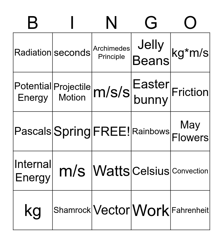 This bingo card has a free space and 24 words: m/s, Shamrock, m/s/s, kg, kg*m/s, Radiation, Potential Energy, seconds, Rainbows, Watts, Easter bunny, Pascals, Celsius, Convection, Projectile Motion, Work, May Flowers, Archimedes Principle, Friction, Spring, Fahrenheit, Internal Energy, Jelly Beans and Vector.