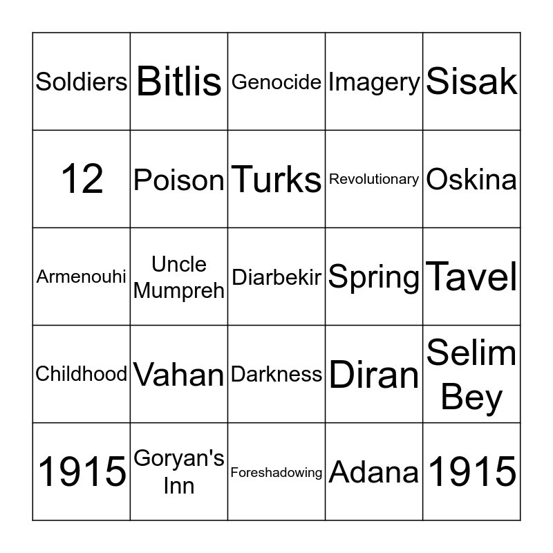 This bingo card has a free space and 24 words: Vahan, Goryan's Inn, Turks, 1915, Sisak, Soldiers, 12, Bitlis, Spring, Darkness, Revolutionary, Armenouhi, Diran, Selim Bey, Poison, Adana, Tavel, Genocide, Oskina, Uncle Mumpreh, 1915, Childhood, Imagery and Foreshadowing.