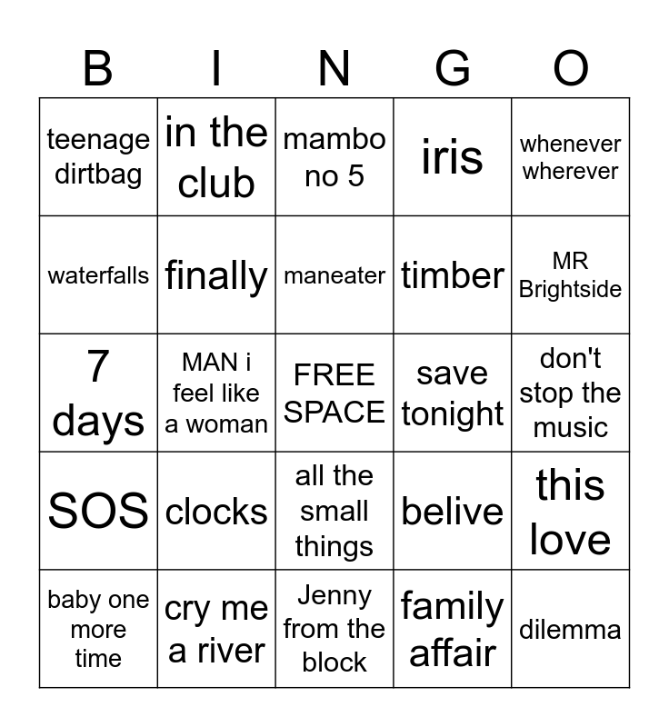 This bingo card has a free space and 45 words: i want it that way, dilemma, where is the love, baby one more time, crazy in love, family affair, mambo no 5, complicated, whenever wherever, cry me a river, iris, save tonight, all the small things, clocks, let me blow your mind, Jenny from the block, love don't cost a thing, 7 days, hips don't lie, MR Brightside, in the club, she will be loved, bad day, teenage dirtbag, a thousand miles, don't stop the music, all star, grace kelly, belive, SOS, bleeding love, this love, it's my life, milkshake, the sweet escape, MAN i feel like a woman, wonderwall, seven nation army, i want you back, maneater, waterfalls, timber, black velvet, finally and smells like teen spirit.