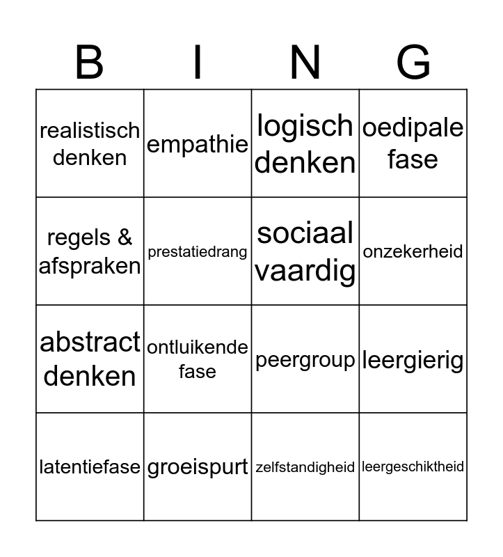 This bingo card has 16 words: groeispurt, leergierig, logisch denken, realistisch denken, abstract denken, empathie, peergroup, zelfstandigheid, regels & afspraken, prestatiedrang, latentiefase, oedipale fase, ontluikende fase, onzekerheid, sociaal vaardig and leergeschiktheid.