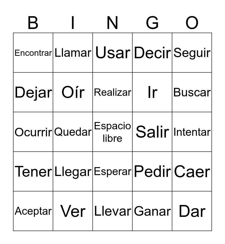 This bingo card has a free space and 24 words: Llegar, Ver, Realizar, Aceptar, Seguir, Encontrar, Dejar, Llamar, Salir, Esperar, Ir, Ocurrir, Pedir, Caer, Oír, Ganar, Intentar, Usar, Buscar, Quedar, Dar, Tener, Decir and Llevar.