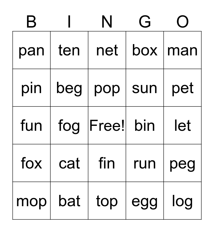 This bingo card has a free space and 24 words: cat, bat, pop, mop, man, pan, pin, ten, bin, fin, sun, fun, run, peg, beg, egg, let, net, pet, fog, log, fox, box and top.