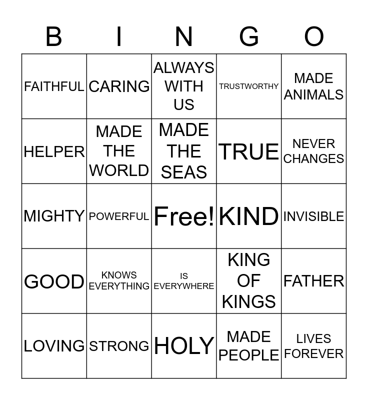 This bingo card has a free space and 29 words: LOVING, WISE, POWERFUL, FAIR, FAITHFUL, ALWAYS WITH US, MADE THE WORLD, KNOWS EVERYTHING, KIND, STRONG, INVISIBLE, LIVES FOREVER, HOLY, MADE PEOPLE, NEVER CHANGES, INFINITE, IS EVERYWHERE, GOOD, MADE ANIMALS, MIGHTY, KING OF KINGS, PERFECT, TRUE, HELPER, TRUSTWORTHY, CARING, FATHER, MADE THE SEAS and MADE THE SUN.