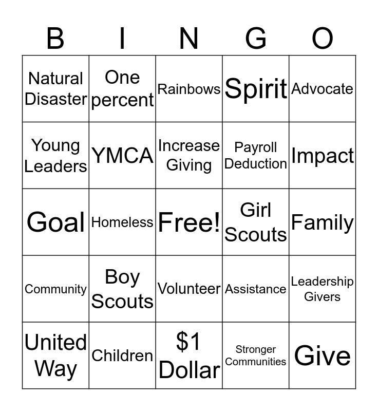 This bingo card has a free space and 29 words: United Way, 2-1-1, Homeless, Mental Health, Natural Disaster, Rainbows, YMCA, Boy Scouts, Girl Scouts, Children, Family, Give, $1 Dollar, Stronger Communities, Impact, Live United, Volunteer, Community, Advocate, Goal, Assistance, Donate, Payroll Deduction, Young Leaders, Spirit, One percent, Leadership Givers, Increase Giving and Fun Week.