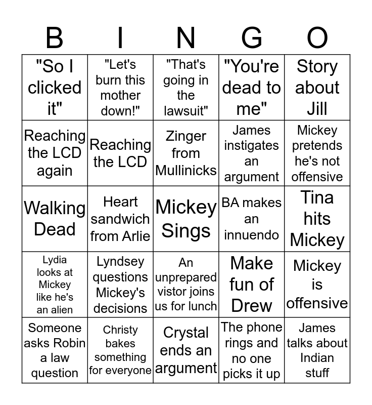 This bingo card has a free space and 24 words: Lyndsey questions Mickey's decisions, Christy bakes something for everyone, Zinger from Mullinicks, Someone asks Robin a law question, Story about Jill, "So I clicked it", Reaching the LCD again, "Let's burn this mother down!", BA makes an innuendo, An unprepared vistor joins us for lunch, James instigates an argument, Walking Dead, Make fun of Drew, Mickey is offensive, Reaching the LCD, The phone rings and no one picks it up, Tina hits Mickey, "That's going in the lawsuit", Mickey pretends he's not offensive, Heart sandwich from Arlie, James talks about Indian stuff, Lydia looks at Mickey like he's an alien, "You're dead to me" and Crystal ends an argument.