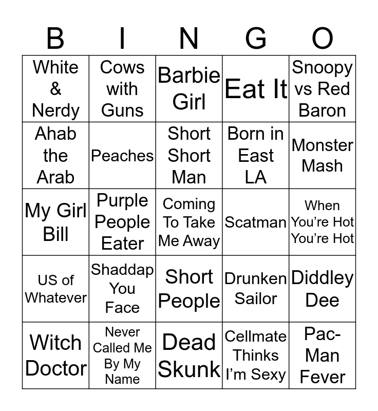 This bingo card has 59 words: Chanukah Song, Never Called Me By My Name, Thanksgiving Song, US of Whatever, Cellmate Thinks I’m Sexy, Mississippi Squirrel Revival, Peaches, Idiot Boyfriend, Born in East LA, Another Irish Drinking Song, Eat It, Convoy, Ahab the Arab, Amish Paradise, Hello Muddah Hello Fadduh, White & Nerdy, Coming To Take Me Away, Snoopy vs Red Baron, I’m Too Sexy, Short Short Man, Scatman, Barbie Girl, Witch Doctor, Diddley Dee, Swingin’, Ballad of Blue Cyclone, Trashy Women, Chewing Gum Lose It’s Flavor?, Monster Mash, King Tut, Charlie Brown, Fish Heads, Can’t Rollerskate in Buffalo Herd, My Ding-a-Ling, Cows with Guns, The Scotsman, Along Came Jones, Purple People Eater, On Top of Spaghetti, My Girl Bill, Tip Toe Through Tulips, Shaddap You Face, When You’re Hot You’re Hot, Yakety Yak, Mashed Potato Time, The Name Game, Shout Shout, Shaving Cream, Short People, Dead Skunk, Rubber Biscuit, Papa Oom Mow Mow, Poison Ivy, Bread and Butter, Big Bad John, Drunken Sailor, Mah Na Mah Na, Pac-Man Fever and Telephone Man.