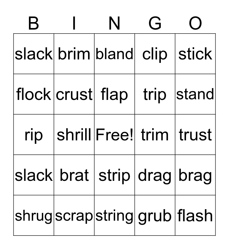 This bingo card has a free space and 24 words: brat, scrap, flap, shrug, stick, slack, flock, brim, trim, strip, trip, rip, drag, brag, crust, grub, trust, bland, stand, shrill, flash, slack, clip and string.