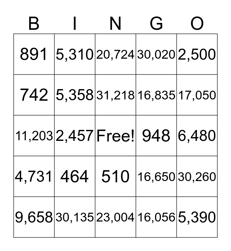 This bingo card has a free space and 26 words: 510, 16,056, 31,218, 30,135, 2,500, 891, 742, 5,310, 6,480, 16,650, 16,835, 11,203, 30,260, 9,658, 2,457, 30,400, 30,020, 4,731, 20,724, 5,390, 17,050, 23,004, 948, 464, 5,358 and 24,748.