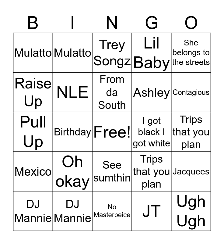 ⚠ This card has duplicate items: NLE (2), DJ Mannie (2), Period (2), Trips that you plan (2), Swervo (2), Mulatto (2)