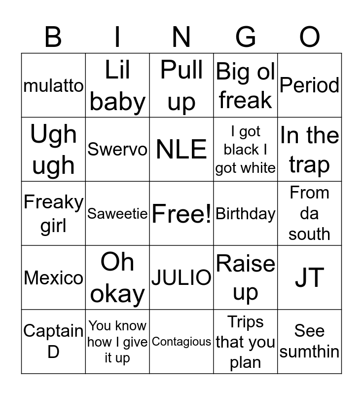 This bingo card has a free space and 28 words: JT, Baby birkin, I got black I got white, Trips that you plan, Ugh ugh, Pull up, Lil baby, Mexico, Birthday, Captain D, Freaky girl, Big ol freak, You know how I give it up, Contagious, In the trap, Section 8, Oh okay, Swervo, NLE, JULIO, mulatto, Dj mannie, See sumthin, Saweetie, From da south, Raise up, Period and She belongs to the streets.