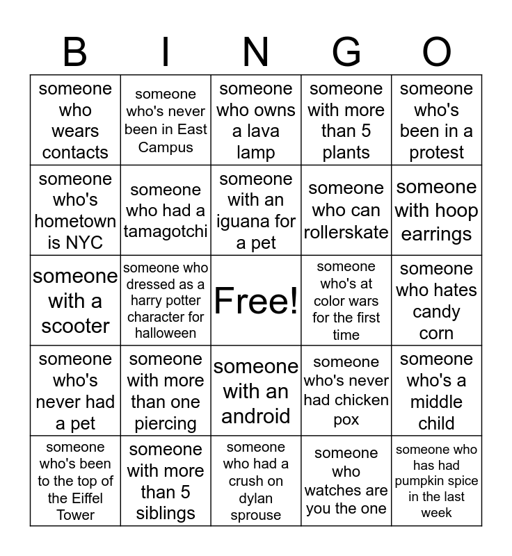 This bingo card has a free space and 24 words: someone with more than one piercing, someone with more than 5 siblings, someone with an iguana for a pet, someone who's been to the top of the Eiffel Tower, someone who's been in a protest, someone who wears contacts, someone who's hometown is NYC, someone who's never been in East Campus, someone who's at color wars for the first time, someone with an android, someone who can rollerskate, someone with a scooter, someone who's never had chicken pox, someone who's a middle child, someone who had a tamagotchi, someone who watches are you the one, someone who hates candy corn, someone who owns a lava lamp, someone with hoop earrings, someone who dressed as a harry potter character for halloween, someone who has had pumpkin spice in the last week, someone who's never had a pet, someone with more than 5 plants and someone who had a crush on dylan sprouse.