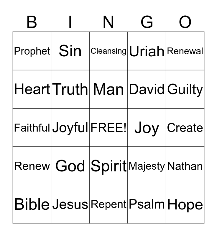 This bingo card has a free space and 24 words: God, Jesus, Man, Bible, Renewal, Prophet, Heart, Sin, Joy, Spirit, David, Faithful, Majesty, Nathan, Truth, Psalm, Create, Cleansing, Guilty, Joyful, Hope, Renew, Uriah and Repent.