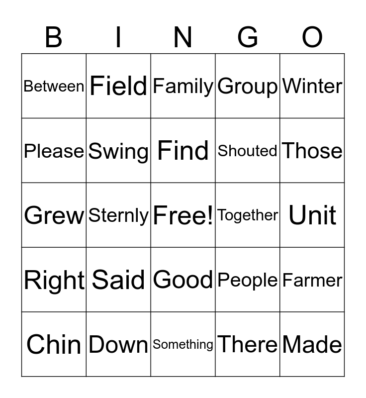 This bingo card has a free space and 34 words: Another, There, They, Both, Right, Swing, Winter, Chin, Field, These, Find, Family, Through, Enough, Together, Those, Down, Grew, Said, People, Good, Letter, Between, Unit, Something, Made, Group, Cried, Shouted, Please, That, Sternly, Farmer and Looked.