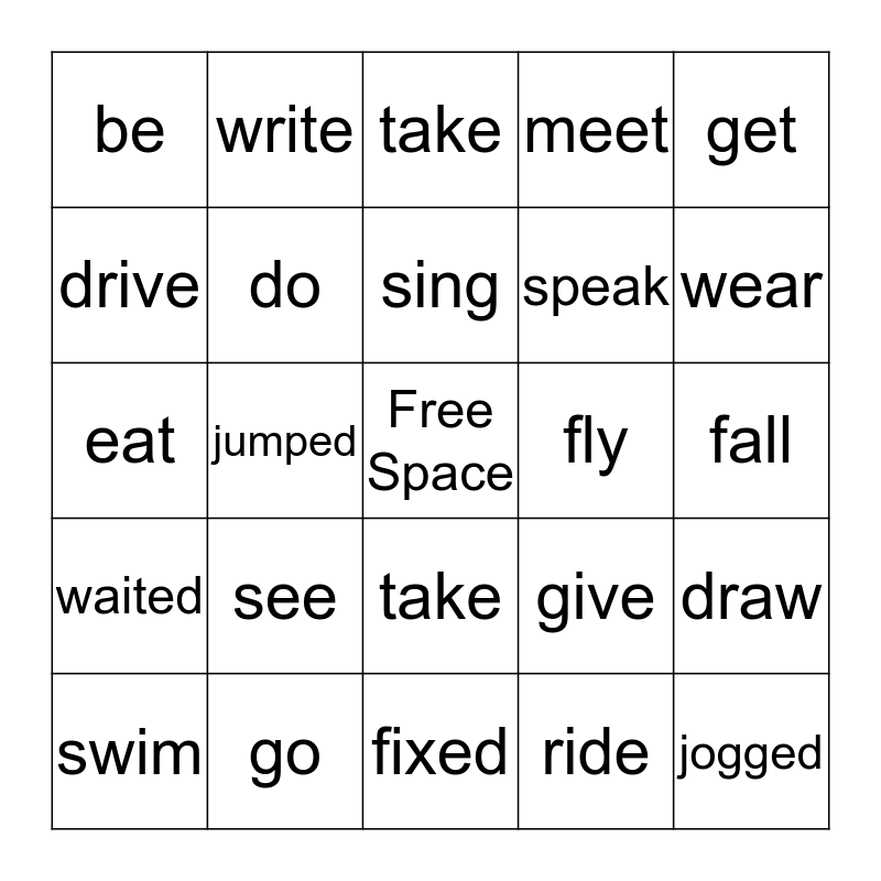 This bingo card has a free space and 24 words: see, go, sing, swim, get, be, drive, write, fly, take, speak, eat, give, draw, do, ride, fall, take, wear, jumped, jogged, waited, meet and fixed.