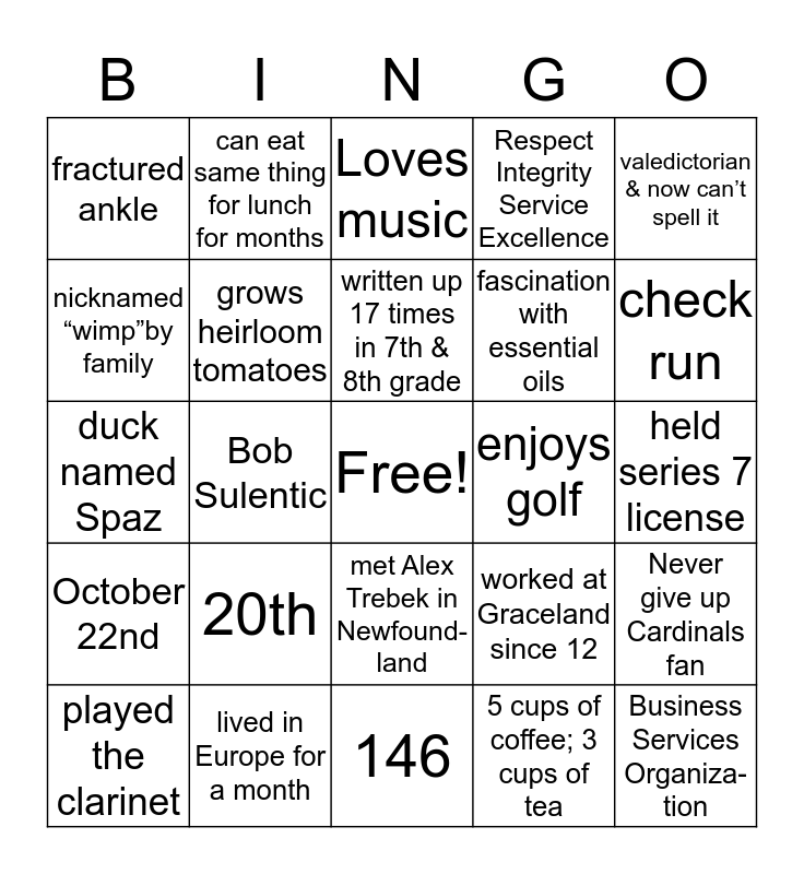 This bingo card has a free space and 24 words: 20th, lived in Europe for a month, written up 17 times in 7th & 8th grade, played the clarinet, valedictorian & now can’t spell it, fractured ankle, nicknamed “wimp”by family, can eat same thing for lunch for months, enjoys golf, met Alex Trebek in Newfound-land, fascination with essential oils, duck named Spaz, worked at Graceland since 12, Never give up Cardinals fan, grows heirloom tomatoes, 5 cups of coffee; 3 cups of tea, held series 7 license, Loves music, check run, Bob Sulentic, Business Services Organiza-tion, October 22nd, Respect Integrity Service Excellence and 146.