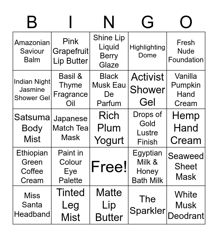 This bingo card has 45 words: Juicy Pear Body Butter, Rich Plum Yogurt, Warm Vanilla Body Scrub, Miss Santa Headband, The Rocket Gift Set, The Sparkler, Shine Lip Liquid Berry Glaze, Star Stamp Highlighter, Fresh Nude Foundation, Tinted Leg Mist, Highlighting Dome, Drops of Gold Lustre Finish, Free!, Paint in Colour Eye Palette, Make Up Setting Spray, Matte Lip Butter, Lip Juicer, Satsuma Body Mist, British Rose Hand Wash, Vanilla Pumpkin Hand Cream, Pink Grapefruit Lip Butter, Strawberry Bath Bomb, Shea Butter, Amazonian Saviour Balm, Almond Nail & Cuticle Oil, Hemp Hand Cream, Peppermint Pumice Foot Scrub, Fuji Green Tea Hair Mask, Egyptian Milk & Honey Bath Milk, Ethiopian Green Coffee Cream, Tea Tree Oil, Seaweed Sheet Mask, Liquid Peel, Vitamin C Microdermabrasion, Drops of Youth Sleeping Mask, Japanese Match Tea Mask, Camomile Cleansing Butter, Cleansing Brush, White Musk Deodrant, Black Musk Eau De Parfum, Indian Night Jasmine Shower Gel, Activist Shower Gel, Green Tea & Lemon Moisturiser, Basil & Thyme Fragrance Oil and Soapstone Oil Burner.