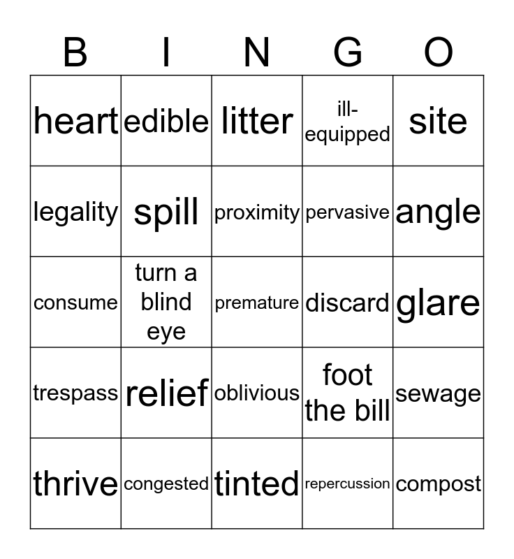 This bingo card has a free space and 24 words: thrive, relief, proximity, repercussion, site, heart, edible, litter, discard, glare, consume, spill, foot the bill, sewage, legality, congested, tinted, ill-equipped, angle, trespass, turn a blind eye, oblivious, pervasive and compost.