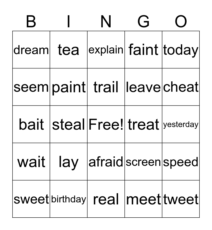 This bingo card has a free space and 25 words: lay, real, trail, sweet, today, dream, seem, tea, treat, afraid, leave, bait, screen, speed, paint, please, yesterday, explain, cheat, steal, tweet, birthday, wait, faint and meet.