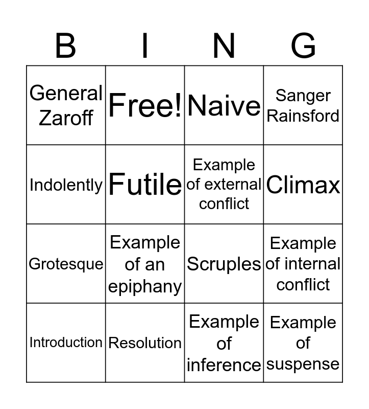 This bingo card has 19 words: Scruples, Palpable, Naive, Example of suspense, Example of internal conflict, Indolently, Example of inference, General Zaroff, Free!, Grotesque, Example of an epiphany, Futile, Example of external conflict, Resolution, Introduction, Conflict, Sanger Rainsford, Climax and Rising Action.