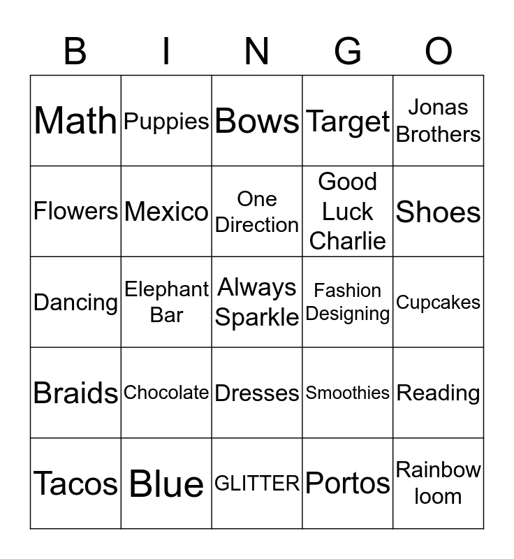 This bingo card has a free space and 24 words: Chocolate, Blue, One Direction, Tacos, Jonas Brothers, Math, Flowers, Puppies, Fashion Designing, Dresses, Good Luck Charlie, Dancing, Smoothies, Reading, Mexico, Portos, Cupcakes, Bows, Shoes, Elephant Bar, Rainbow loom, Braids, Target and GLITTER.