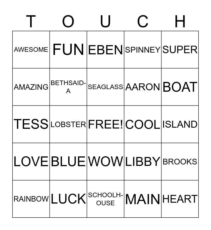 This bingo card has a free space and 24 words: BLUE, LUCK, SEAGLASS, RAINBOW, SUPER, AWESOME, AMAZING, FUN, COOL, WOW, AARON, TESS, LIBBY, BROOKS, BETHSAID-A, MAIN, ISLAND, EBEN, BOAT, LOBSTER, HEART, LOVE, SPINNEY and SCHOOLH-OUSE.