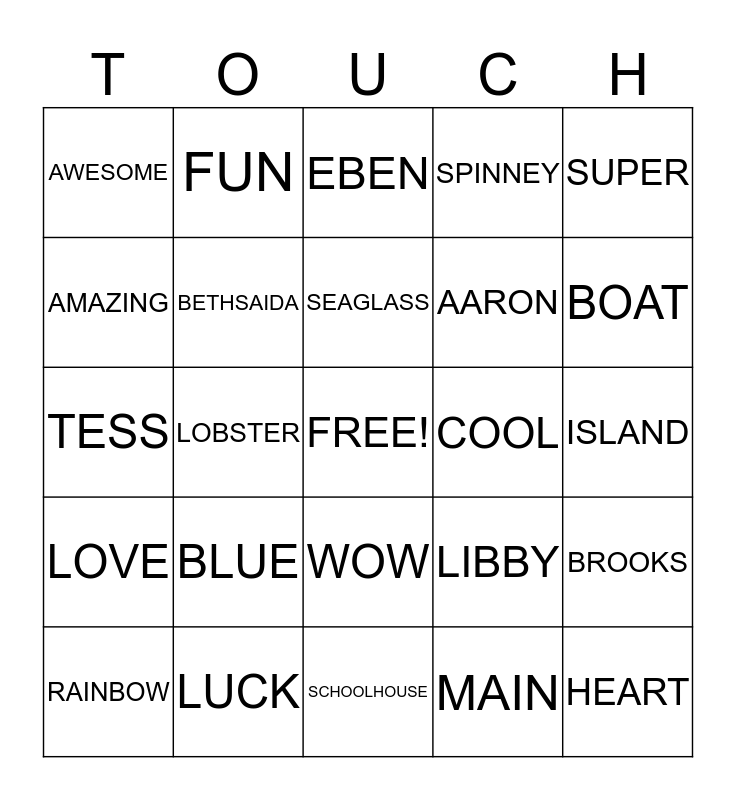 This bingo card has a free space and 24 words: BLUE, LUCK, SEAGLASS, RAINBOW, SUPER, AWESOME, AMAZING, FUN, COOL, WOW, AARON, TESS, LIBBY, BROOKS, BETHSAIDA, MAIN, ISLAND, EBEN, BOAT, LOBSTER, HEART, LOVE, SPINNEY and SCHOOLHOUSE.