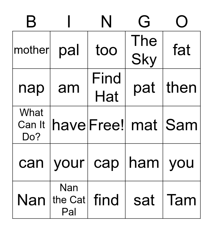 This bingo card has a free space and 31 words: find, has, have, his, mother, too, am, ham, mat, sat, Sam, Tam, do, what, then, with, you, your, can, cap, fat, lap, Nan, pal, pat, nap, The Sky, What Can It Do?, Nan the Cat Pal, Find Hat and at.