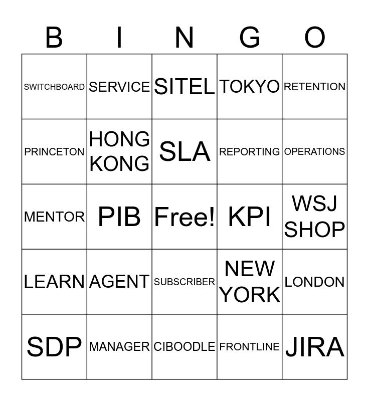 This bingo card has a free space and 50 words: CUSTOMER, JIRA, OLD, CIBOODLE, AGENT, SALESFORCE, SERVICE, DJ, PRINCETON, BARCELONA, HONG KONG, TOKYO, LONDON, NEW YORK, HELP, FRIENDLY, SLA, KPI, MEMBER SERVICES, RETENTION, PIB, FRONTLINE, SWITCHBOARD, REPORTING, SYSTEMS SUPPORT, TRAINING, OPERATIONS, GROUP ACCOUNTS, SITEL, SUBSCRIBER, XDATE, ACCOUNT NUMBER, TEAM LEADER, SUPERVISOR, MANAGER, QA, WIKI, SLACK, WORKDAY, WSJ SHOP, COURACCESS, ININ, FILENET, CMS, SDP, MENTOR, MENTEE, SHADOW, LEARN and ICBM.