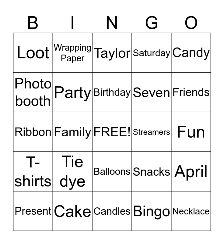 This bingo card has a free space and 24 words: Tie dye, Cake, Birthday, Present, Candy, Loot, Photo booth, Wrapping Paper, Streamers, Balloons, Seven, Ribbon, Snacks, April, Party, Bingo, Fun, Taylor, Friends, Family, Necklace, T-shirts, Saturday and Candles.