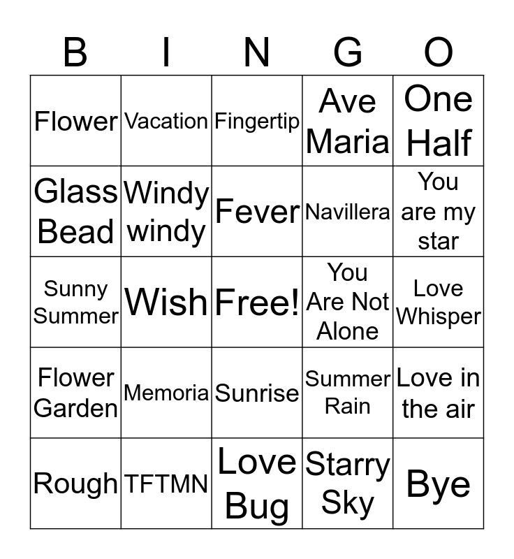 This bingo card has a free space and 24 words: Memoria, TFTMN, Fever, Rough, One Half, Flower, Glass Bead, Vacation, You Are Not Alone, Sunrise, Navillera, Sunny Summer, Summer Rain, Love in the air, Windy windy, Starry Sky, Love Whisper, Fingertip, You are my star, Wish, Bye, Flower Garden, Ave Maria and Love Bug.