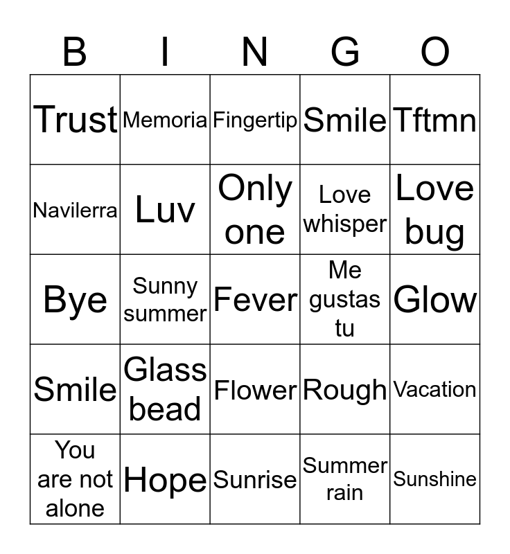 This bingo card has a free space and 24 words: Glass bead, Hope, Only one, You are not alone, Tftmn, Trust, Navilerra, Memoria, Me gustas tu, Flower, Love whisper, Bye, Rough, Vacation, Luv, Summer rain, Glow, Fingertip, Love bug, Sunny summer, Sunshine, Smile, Smile and Sunrise.
